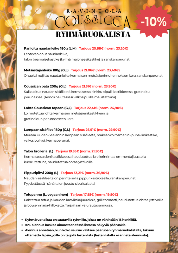 Kiitoksena tarjoamme 10 % alennuksen pääruokien normaalihinnasta, edellytyksenä että koko seurue valitsee pääruoan ryhmäruokalistalta, lukuun ottamatta lapsia, joille on tarjolla lastenlista.